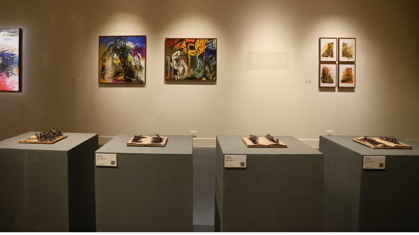 The exhibition presents diverse approaches to these complex themes. Jagath Weerasinghe’s figurative works directly respond to the social and political violence of Sri Lanka’s conflicts, urging the viewers to look beyond simplified narratives and recognise the politics of nationalism. Kingsley Gunatillake’s sculpture and calligraphy-inspired work, explores the complex relationship between violence as a tool and the elusive peace it seeks to achieve. Pala Pothupitiye’s historical approach challenges the viewer, provoking a new ‘social consciousness’ to problematise power, capital and vested interest in the aftermath of war. Muhanned Cader’s visualscapes depict the land, sea and sky as silent witnesses to the violence inflicted upon them as victims, and not, simply, as landscapes of war. Anoli Perera interrogates the complexities of gender as it intersects with violence, memory and loss through a labour-intensive process of transforming raw materials, exposing the patriarchal structures of violence that marginalises women’s specific traumas and experiences. Finally, Chandraguptha Thenuwara’s work compels the viewer to shed their blindness and confront the ‘every day’, to question power and to seek truth, justice and accountability.
