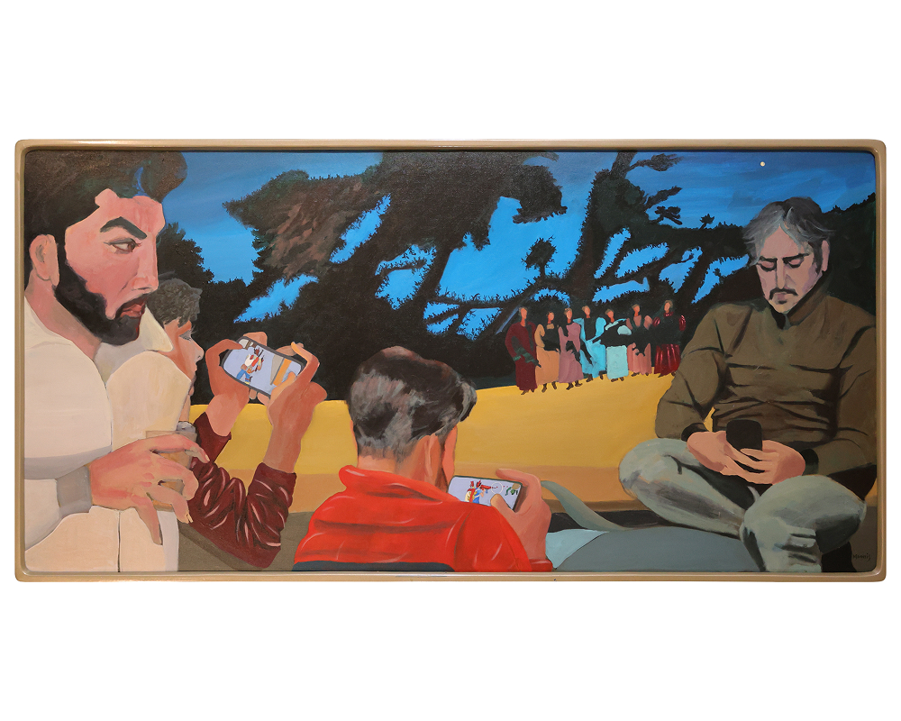 Acrylic on canvas and hand-carved teak wood frame