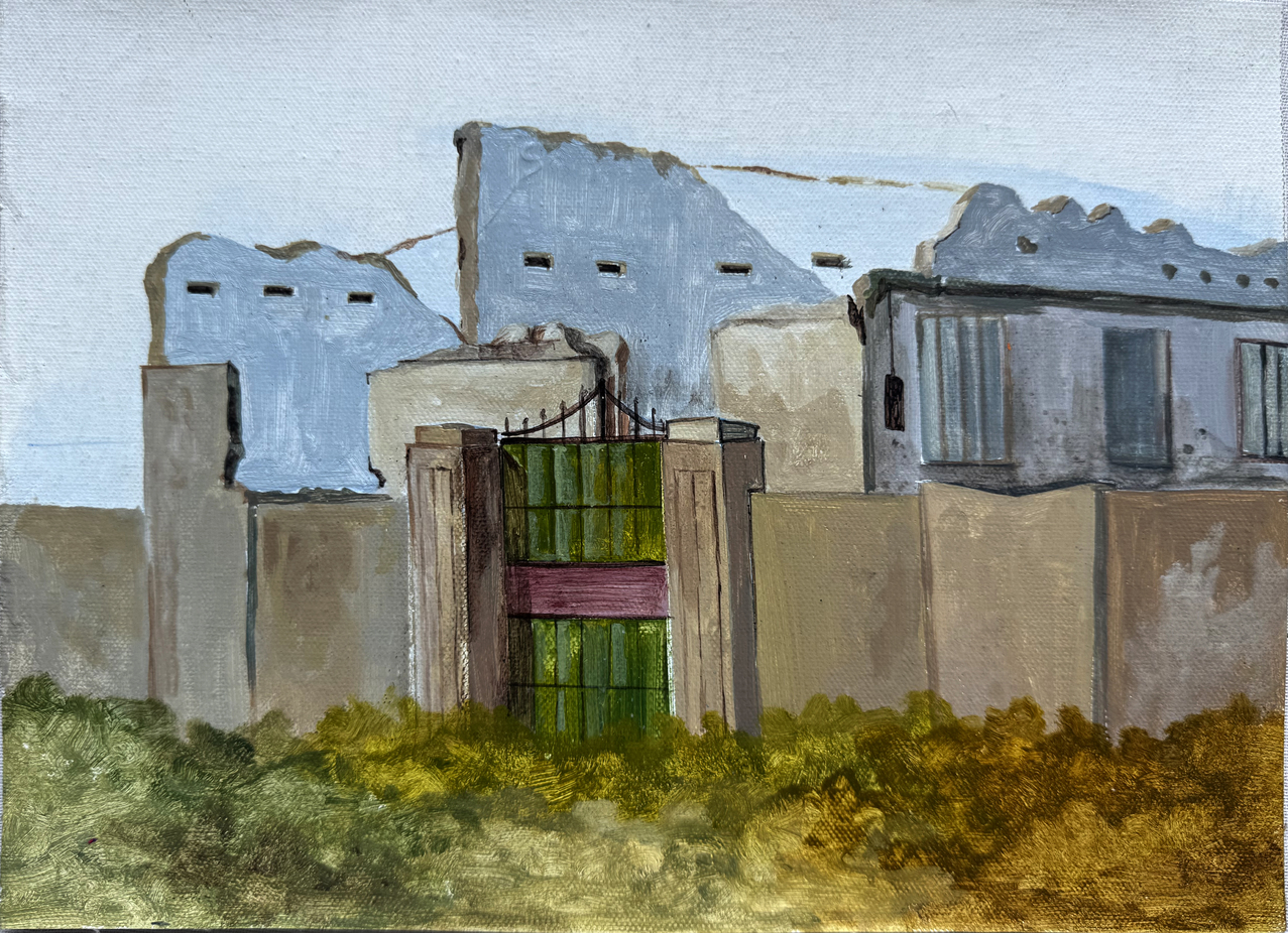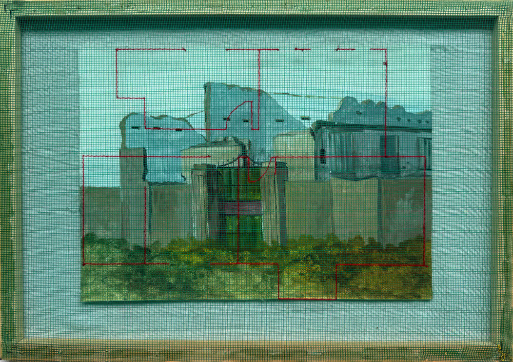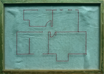 Hand stitched on green mash and oil paint on canvas