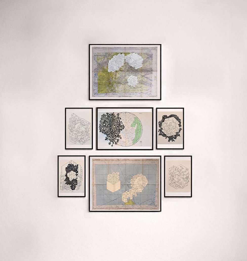 Ink on paper, vintage maps and prints
