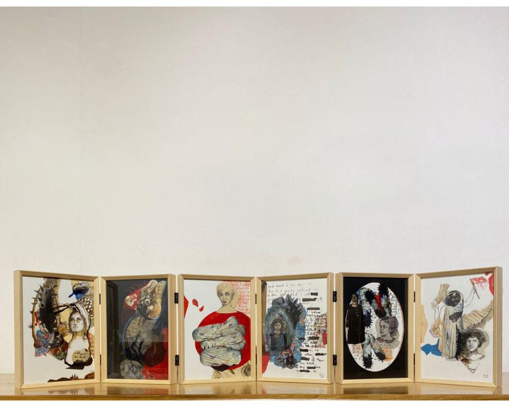 • Acrylic, ink, pencil and printed image on watercolour paper